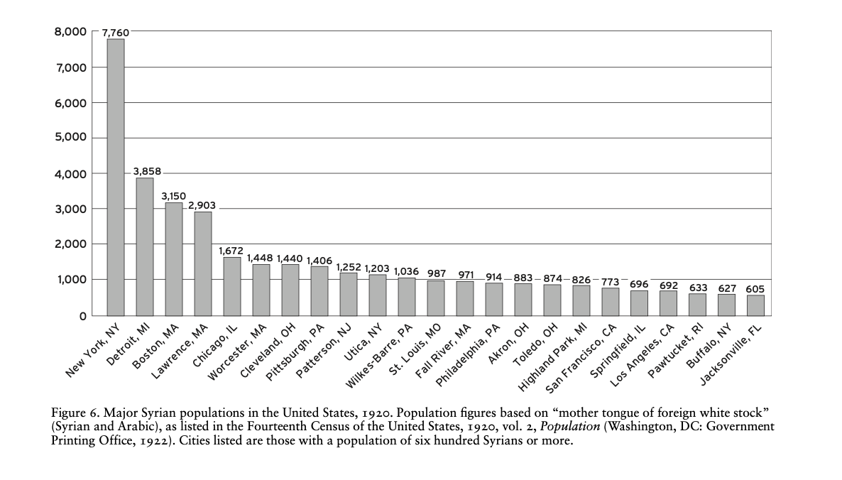 Major Syrian populations in the United States, 1920. Population figures based on “mother tongue of foreign white stock” (Syrian and Arabic), as listed in the Fourteenth Census of the United States, 1920, vol. 2, Population (Washington, DC: Government Printing Office, 1922). Cities listed are those with a population of six hundred Syrians or more.
